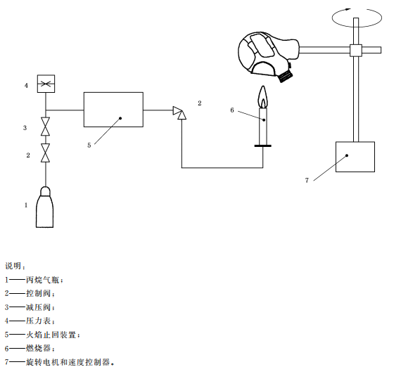 測(cè)試原理:將被測(cè)試樣佩戴在金屬頭模上,調(diào)整金屬頭模高度,使燃燒器頂端與面罩最下端垂直距離為20mm,然后使金屬頭模位于燃燒器燃燒范圍外。點(diǎn)燃燃燒器后,調(diào)節(jié)燃燒器火焰,使燃燒器火焰高度達(dá)到40mm,使距離燃燒器頂端20mm處的火焰溫度達(dá)到800℃。啟動(dòng)金屬頭模運(yùn)動(dòng)控制裝置,使被測(cè)試樣經(jīng)過(guò)燃燒區(qū),記錄通過(guò)火焰上方時(shí)面罩材料的燃燒情況。